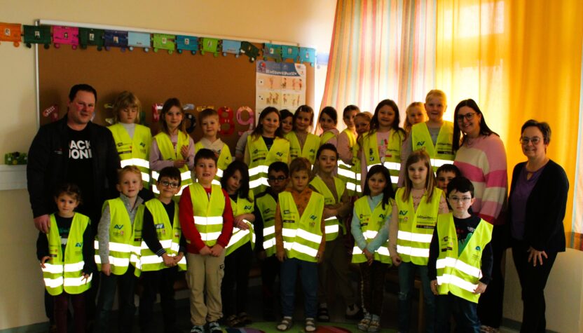 Er betonte die Wichtigkeit des Tragens der Warnweste und zeigte den Kindern auch, wie wichtig die Warnweste für ihre Sicherheit ist. Mit der Warnweste wird man von weitem gesehen.